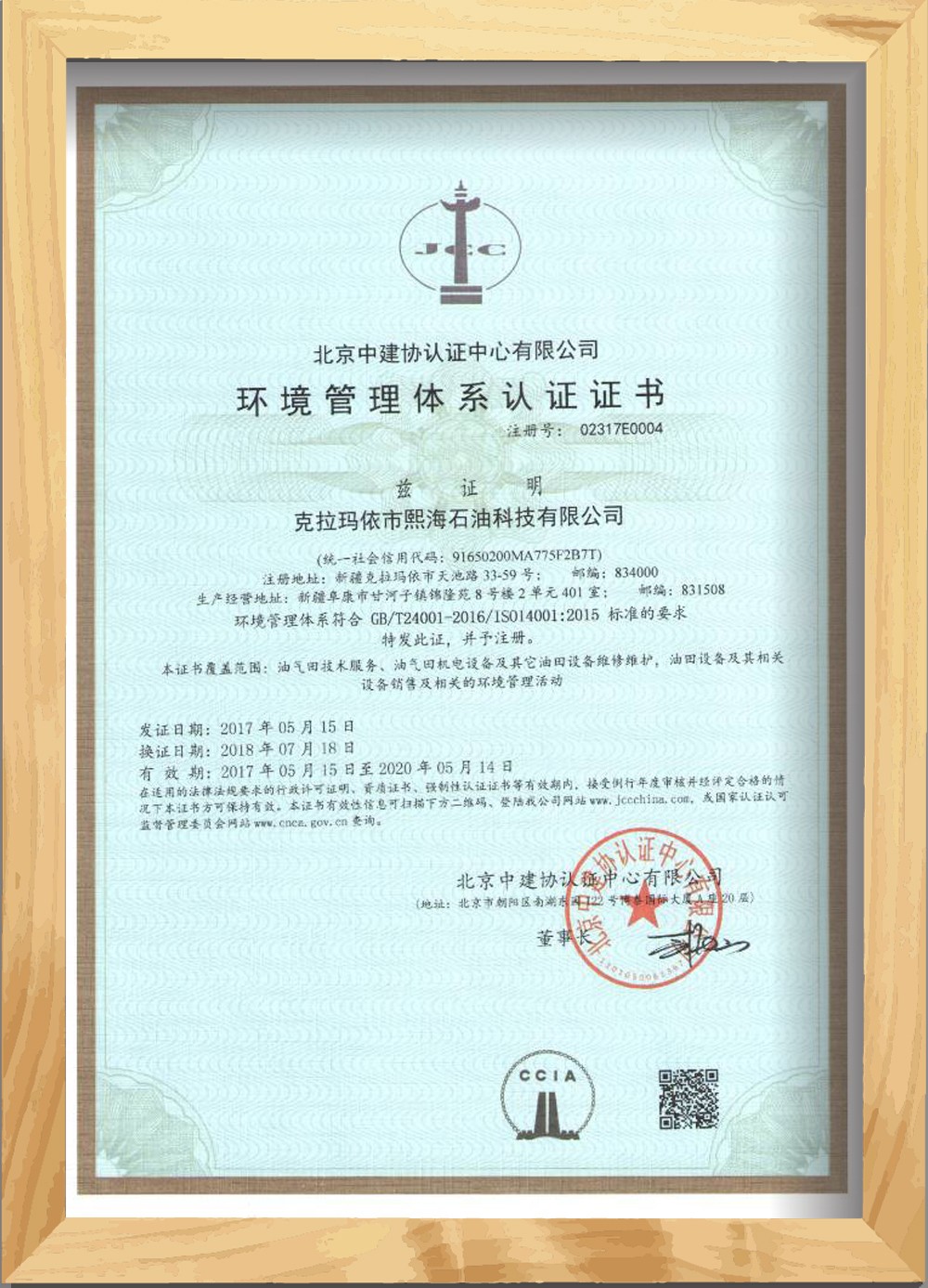 環境管理體系認證證書