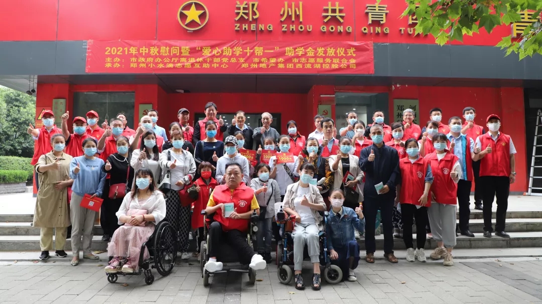 在中秋佳節來臨之際,由鄭州市政府辦公廳離退休干部黨總支、鄭州市希望工程辦公室、鄭州市志愿服務聯合會主辦,鄭州市小水滴志愿互助中心、鄭州地產集團西流湖控股公司聯合承辦的2021年中秋慰問暨“愛心助學十幫一”助學金發放儀式于9月17日上午在鄭州共青團青春家園舉行。