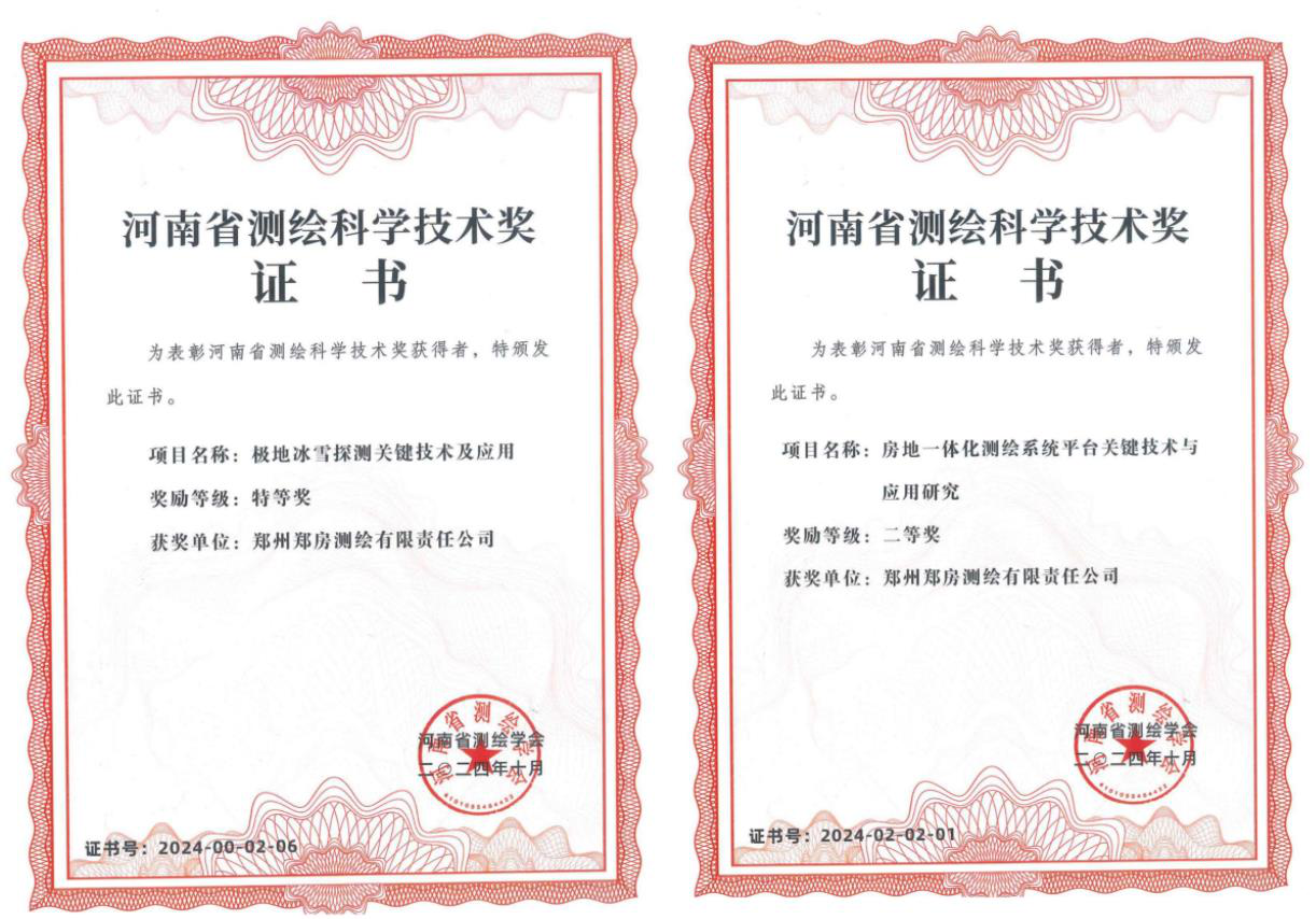 ?近期,鄭州鄭房測繪有限責任公司在科研領域取得重大突破,與相關單位聯合研發的《極地冰雪探測關鍵技術及應用》和《房地一體化測繪系統平臺關鍵技術與應用研究》兩個項目分別榮獲河南省測繪學會頒發的科學技術成果特等獎和二等獎,為公司科技創新工作再添濃墨重彩的一筆。