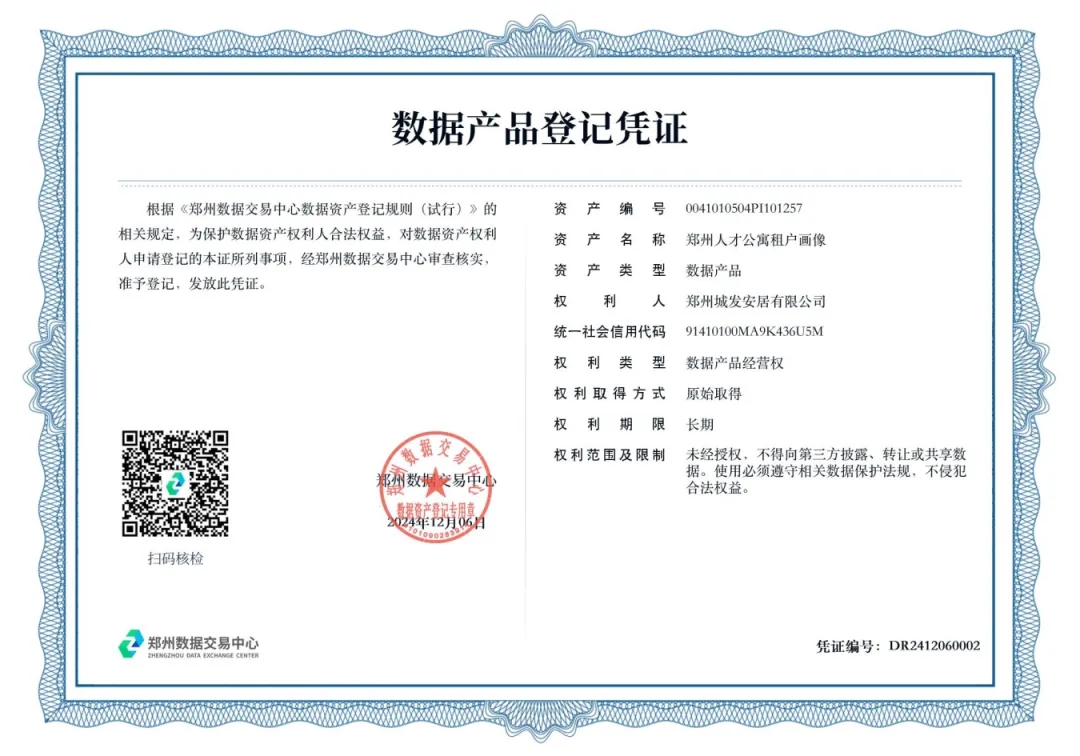 12月6日,鄭州城市發(fā)展集團(tuán)有限公司下屬子公司鄭州城發(fā)安居有限公司(以下簡稱“城發(fā)安居”)在鄭州數(shù)據(jù)交易中心成功完成了“鄭州人才公寓租戶畫像”的資產(chǎn)登記,正式取得數(shù)據(jù)產(chǎn)品登記憑證,成為鄭州首例將人才公寓運(yùn)營數(shù)據(jù)資產(chǎn)入表的市屬國企。