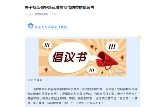 為深入貫徹市國資委、集團加強疫情防護工作部署要求,進一步加強平安建設,有效落實公司疫情防控工作會議精神,西流湖公司、鄭地發展公司、鄭地合新公司始終秉承國企的責任擔當,堅持人民至上、生命至上,貫徹“預防為主、安全第一”的方針,結合公司《新冠肺炎疫情防控工作方案》明確分工,緊盯重點部位、關鍵環節,積極采取各類措施,加強公司辦公區及工程建設工地的疫情防控,維護全體職工健康安全,營造平安建設良好生態環境。