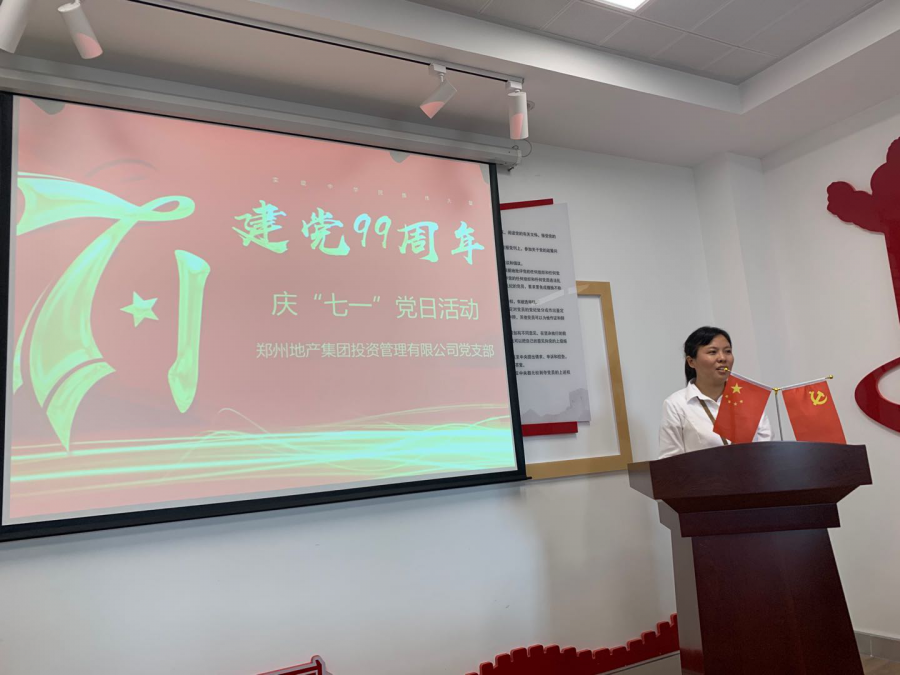 為熱烈慶祝建黨99周年,激發公司廣大黨員的責任感、榮譽感和使命感,鄭州地產集團投資管理有限公司黨支部開展慶祝建黨99周年·“七一”黨日活動。在黨的生日這天,組織全體黨員重溫初心承諾、學習理解黨的文化內涵、講述家風傳承故事。