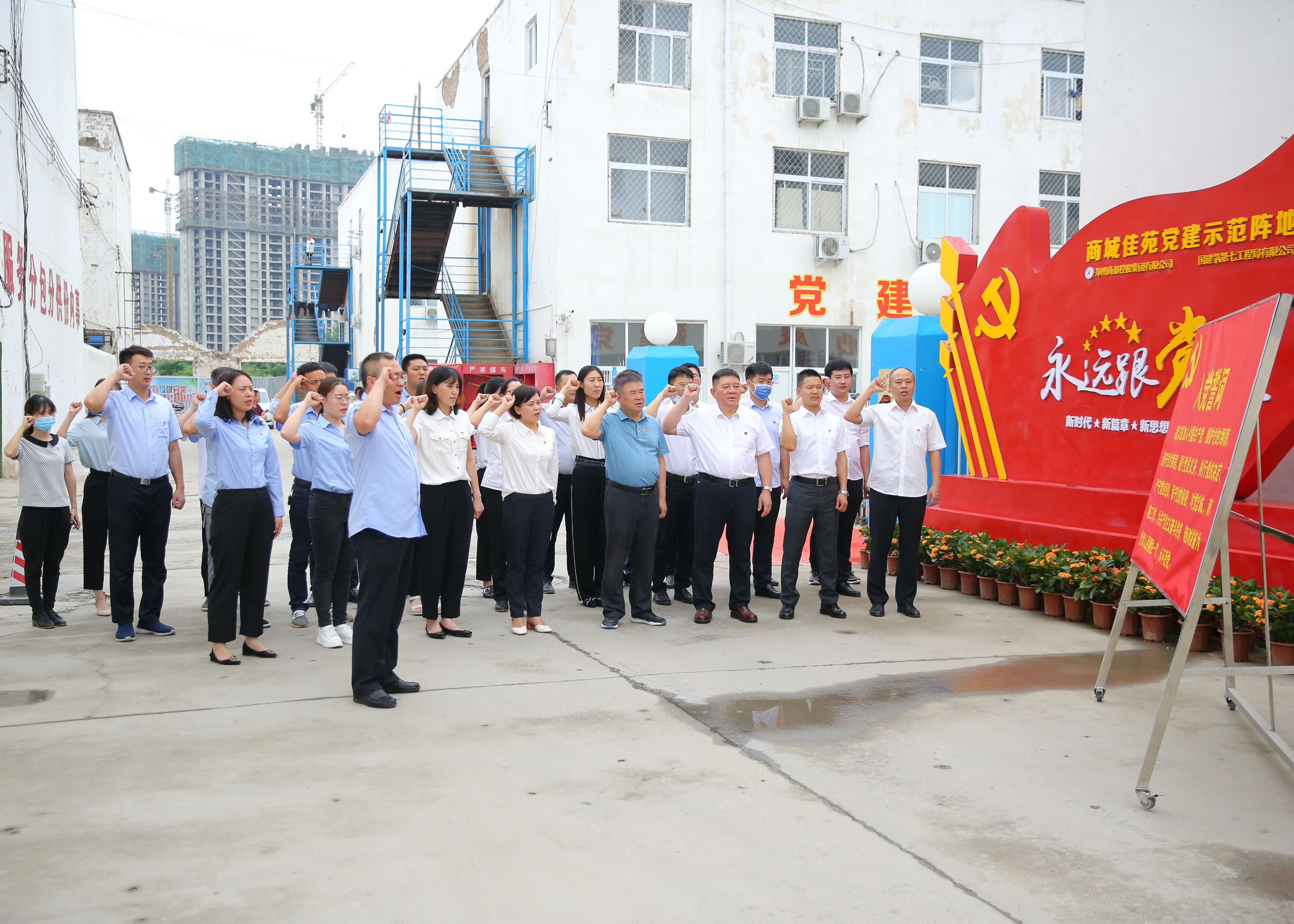 為充分發揮支部戰斗堡壘作用和黨員先鋒模范作用,商城佳苑項目建設單位(鄭州商都控股集團有限公司)和施工單位(中建七局)黨支部,緊扣“三項工程、一項管理”工作重心,遵照“圍繞項目抓黨建,抓好黨建促項目”工作思路,聯合成立了該項目臨時黨支部,動員每位黨員凝聚思想共識,形成工作合力,增強黨建引領城市高質量建設的使命感,真正落實“支部建在項目上,黨旗插在工地上”。